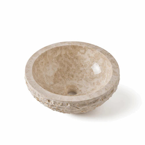 De Waskom Horta Beige 40x40x15 cm is een marmeren waskom, vervaardigd uit 100% natuursteen. Deze ronde natuursteen waskom met beige kleur heeft een unieke uitstraling met een geribbelde buitenkant en een gladde binnenkant, wat zorgt voor een prachtig contrast. De wit/beige kleur van het marmer voegt een subtiele en elegante tint toe aan elke ruimte.
