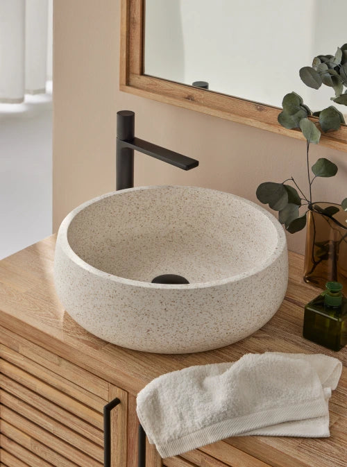 Breng karakter en klasse in uw ruimte met de Terrazzo Waskom Florencia in wit. Deze stijlvolle waskom van 39x39x14 cm is vervaardigd uit hoogwaardig terrazzo en valt op door zijn ronde vorm, subtiele glans en verfijnde spikkels in natuurlijke tinten. De combinatie van ambachtelijk vakmanschap en een strak, modern silhouet maakt deze terrazzo waskom een ideale keuze voor een eigentijdse badkamer met een warme, persoonlijke uitstraling.