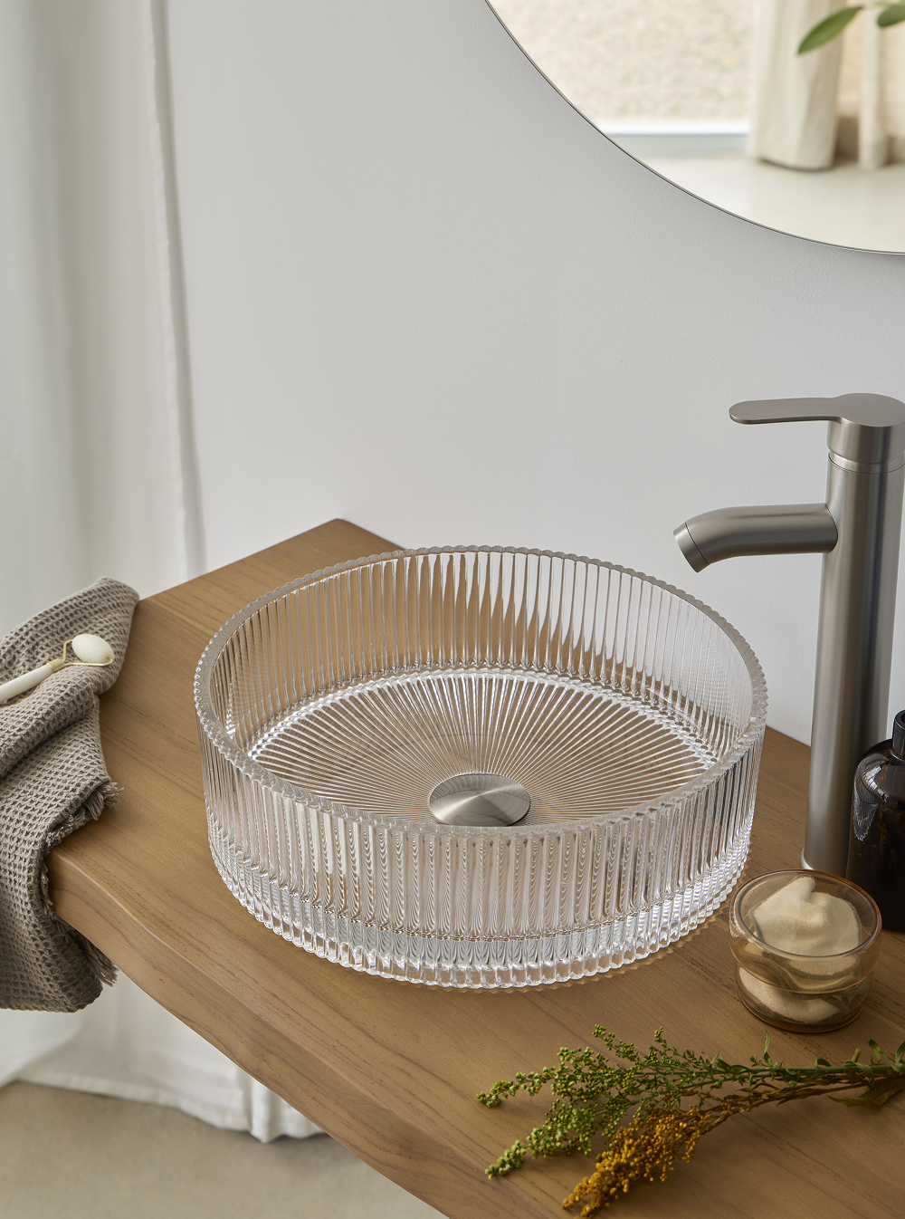De Glazen Waskom Casteno is een stijlvolle opzetwaskom met een uniek kristalachtig oppervlak. Het transparante glas zorgt voor een luxe uitstraling en een bijzonder lichtspel in de badkamer. Dankzij het ronde design past deze ronde design waskom perfect op een modern wastafelblad. Meer mogelijkheden zien? Bekijk hier onze volledige collectie glazen waskommen.